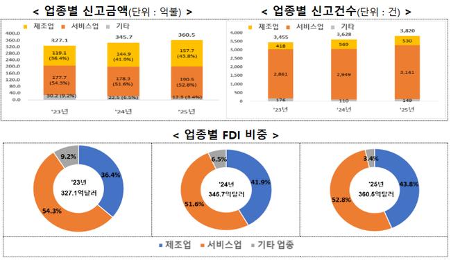 산업통상자원부는 2025년 연간 외국인직접투자 신고액이 전년 대비 4.3% 증가한 360.5억 달러로 역대 최대를 기록했고, 자금 도착액도 179.5억 달러로 16.3% 늘었다고 밝혔다.연간 외국인직접투자는 2022년 304.4억 달러에서 2023년 327.1억 달러, 2024년 345.7억 달러에 이어 2025년 360.5억 달러로 증가세를 이어갔다. 자금 도착 기준으로도 2024년 154.3억 달러...