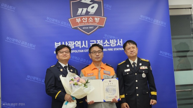 부산 금정소방서 부곡의용소방대(대장 임성태) 소속 방호부장 이태돈 대원(사진 가운데)이 2025년 7월 18일 금정소방서 회의실에서 열린 부곡의용소방대 7월 정기회의에서 행정안전부 장관 표창을 받았다.