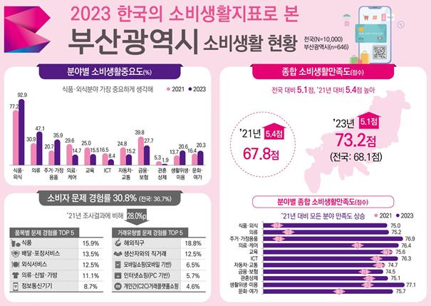 한국소비자원이 발표한 2023년 소비생활지표 조사 결과, 부산광역시는 종합 소비생활만족도에서 73.2점을 기록하며 전국 최고 수준을 달성했다.