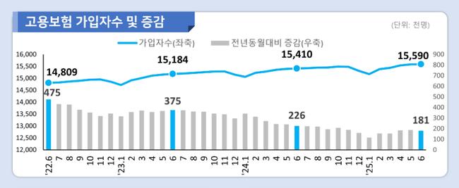 2025년 6월 말 기준 고용보험 상시가입자 수가 1,559만명을 기록하며 전년 동월 대비 18만1천명(1.2%) 증가한 것으로 나타났다.