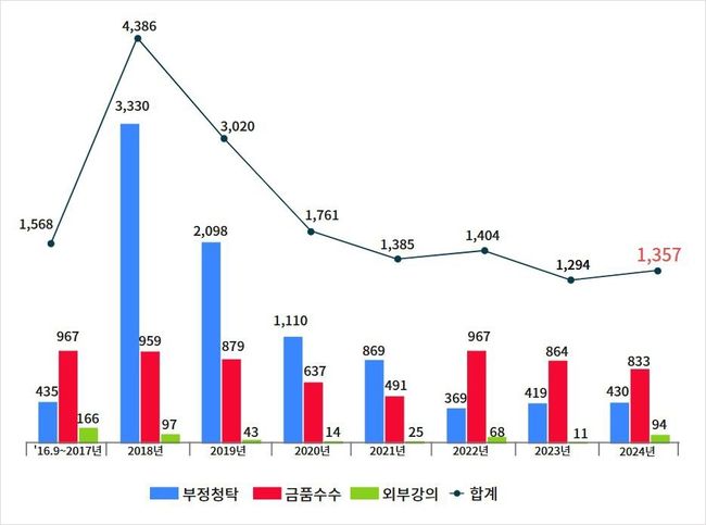 청탁금지법은 2016년 9월 시행된 이후 2024년 말까지 총 1만6,175건의 위반 신고가 접수됐으며, 이 가운데 금품수수가 6,597건(40.8%)으로 높은 비중을 차지했다. 특히 제재 대상자 2,643명 중 2,504명(94.7%)이 금품수수로 처분받았고, 2024년 한 해에만 430명이 같은 사유로 제재됐다.