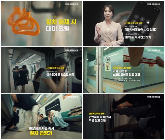 영상은 ‘열차 내 화재 대응’과 ‘역사 내 화재 대응’ 두 가지 상황으로 나눠 제작됐다. 열차 내 화재 발생 시에는 기관사와 119에 즉시 신고한 뒤, 옆 칸으로 신속히 이동하고, 낮은 자세를 유지한 채 인접 역사 도착 후 스크린도어를 열고 대피하는 과정을 안내한다.