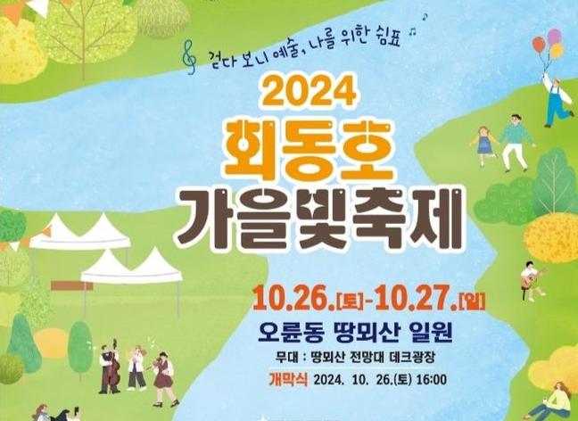2024 회동호 가을빛 축제는`걷다 보니 예술, 나를 위한 쉼표`라는 주제로 오전 10시부터 오후 5시까지 진행되며 ▲숲속 미션투어(걷기+공예체험) ▲숲속 음악회(문화공연) ▲숲멍물멍(쉼터) ▲숲속 요가·명상(요가, 싱잉볼 명상) ▲회동호 감성길(포토존) 등 다양한 프로그램이 숲길 곳곳에 준비된다.