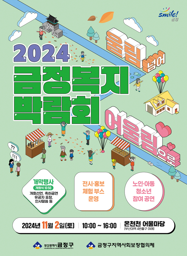 2024 금정복지박람회가 금정구와 금정구지역사회보장협의체 공동 주관으로 11월 2일(토) 오전 10시부터 오후 4시까지 온천천 어울마당(부산대역 4번 출구 아래)에서 열린다. 이번 복지박람회는 "울림 넘어 어울림으로"라는 주제로 개막식과 전시, 홍보, 체험 부스를 운영하며, 노인, 아동, 청소년의 공연으로 이루어진다.